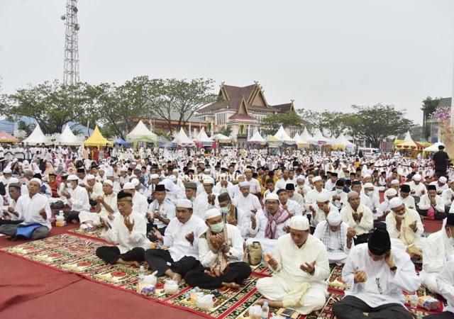 HARIANRIAU.CO - Lapangan Upacara Gajah Mada Tembilahan dipadati oleh masyarakat sejak ba’da Ashar. Hal tersebut dikarenakan istighotsah, tabligh akbar, dan buka puasa aysura bersama dalam rangka Puncak Peringatan Gema Muharram 1441 H Kabupaten Indragiri Hilir (Inhil), Selasa (10/9/2019).