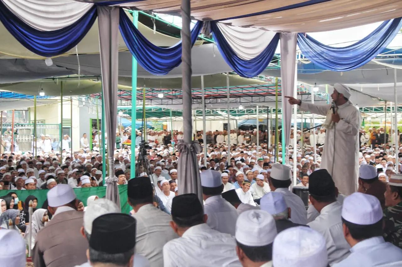 Ribuan masyarakat ini hadir dalam rangka dzikir dan doa bersama dalam memperingati Haul Syekh Abdul Qodir Al Jailani dan mendengarkakn Tausiyah agama oleh Al Habib Achmad Jamal Bin Thoha Bagil Pengasuh Ponpes Anwaruttafiq, Malang, Jawa Timur.