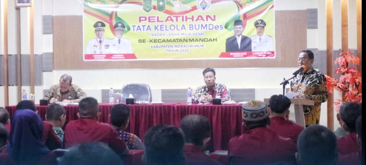HARIANRIAU.CO - Bupati Indragiri Hilir, Drs. HM. Wardan, MP didampingi Kepala Dinas Pemberdayaan Masyarakat dan Desa (PMD), Budi Nugroho Pamungkasmembuka secara resmi Pelatihan Tata Kelola Badan Usaha Milik Desa (BUMDes) Se-Kecamatan Mandah, bertempat di Hotel Harmoni, belum lama ini.